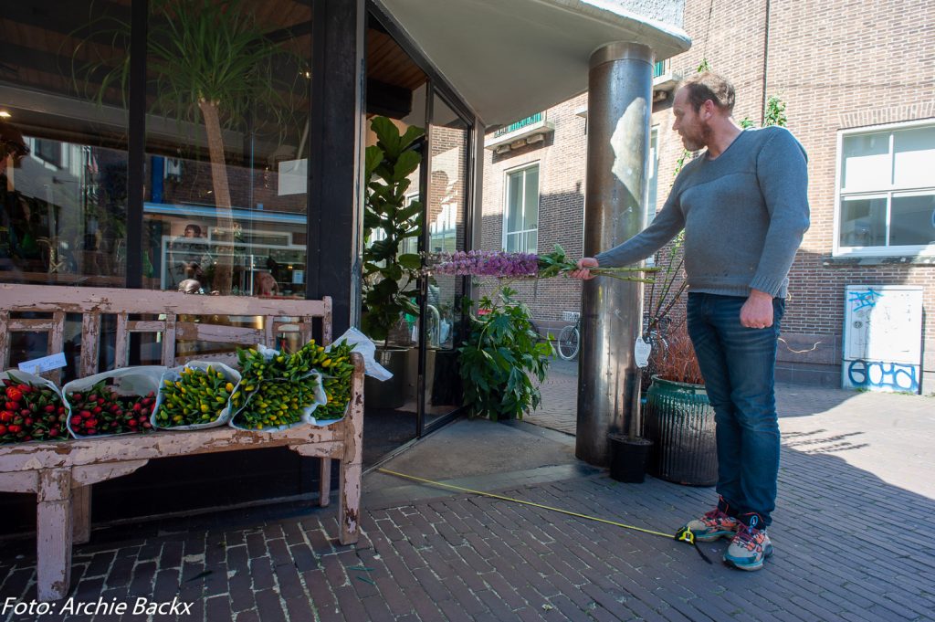 ‘Inmiddels niet meer, maar ik heb de bloemetjes wel een paar weken binnengezet, zeg maar. Het was niet meer verantwoord om open te blijven. We stonden vanachter een koordje door het raam boeketten en planten te verkopen. Zie je het voor je?’ Maar achter de gesloten deuren van de voor het oog donkere winkel lag de bloemenhandel bepaald niet stil. ‘Al klapte mijn omzet wel in elkaar. Na de sluiting zijn we dan ook als een malle bestellingen gaan draaien. Pasen, Moederdag, dat zijn boekettendagen bij uitstek. Maar vergis je niet, bestellingen zijn veel bewerkelijker dan klanten in je winkel helpen. Veel saaier ook trouwens. Elke dag ging de wekker om 04.45 uur: hop, naar de veiling, lossen in de winkel, langs de bouwmarkt, lossen in de kerk, tot een uurtje of vier klussen, terug naar de zaak en boeketten maken, boeketten maken en nog eens boeketten maken, tot diep in de avond. Soms wel 80 boeketten per dag. Sabrina, al 20 jaar mijn steun en toeverlaat, reed gemiddeld 150 km per dag door Haarlem centrum en mijn medewerkster Anna hielp met de boeketten in de winkel. Dat was ons coronarooster tijdens de lockdown maand. We waren een soort bloemen Delivero geworden.’